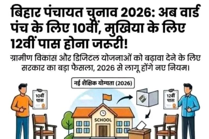 बिहार में प्रस्तावित पंचायत चुनाव 2026 को लेकर शैक्षणिक योग्यता से जुड़ा बड़ा बदलाव सामने आया है। नए नियमों के तहत वार्ड पंच पद के उम्मीदवारों के लिए न्यूनतम 10वीं पास और मुखिया/सरपंच पद के लिए 12वीं पास होना अनिवार्य किया जा सकता है।