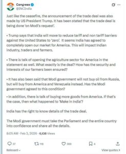 कांग्रेस ने मंगलवार को सोशल मीडिया प्लेटफॉर्म एक्स पर एक पोस्ट के जरिए सबसे पहले इस डील की घोषणा के तरीके पर सवाल उठाए। पार्टी ने कहा कि युद्धविराम की तरह ही इस व्यापार समझौते की जानकारी भी पहले अमेरिकी राष्ट्रपति ने दी, जो चिंता का विषय है। कांग्रेस ने ट्रंप के उन दावों पर भी सवाल किए, जिनमें कहा गया है कि भारत अमेरिका के खिलाफ टैरिफ और गैर-टैरिफ बाधाओं को ‘शून्य’ तक कम करने की दिशा में कदम उठाएगा।
