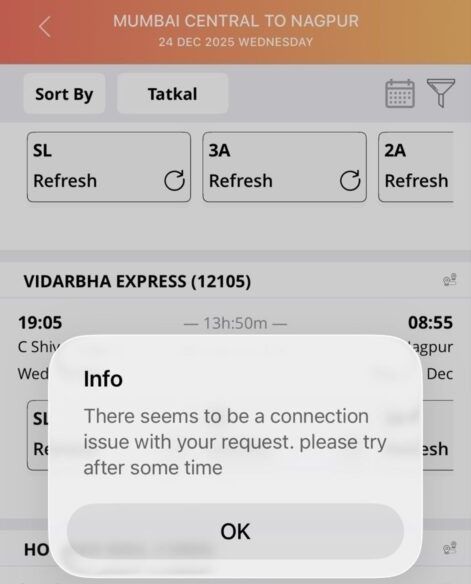 मीडिया रिपोर्ट्स के मुताबिक, Tatkal बुकिंग के समय सर्वर पर अत्यधिक लोड के कारण यह समस्या सामने आई। हालांकि, IRCTC की ओर से अभी तक इस मुद्दे पर कोई विस्तृत आधिकारिक बयान नहीं आया है। यात्रियों ने मांग की है कि या तो सिस्टम सुधारा जाए या Tatkal व्यवस्था को पारदर्शी बनाया जाए।