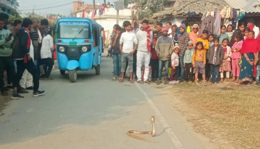 Bihar: हथौड़ी (मुजफ्फरपुर)। नए साल 2026 के पहले ही दिन हथौड़ी इलाके में लोगों को एक हैरान कर देने वाला नजारा देखने को मिला। गुरुवार दोपहर छपरा–हथौड़ी मार्ग पर नरमा गांव के पास एक गेहूंअन सांप बीच सड़क पर फन फैलाकर बैठ गया, जिससे यातायात पूरी तरह ठप हो गया।
