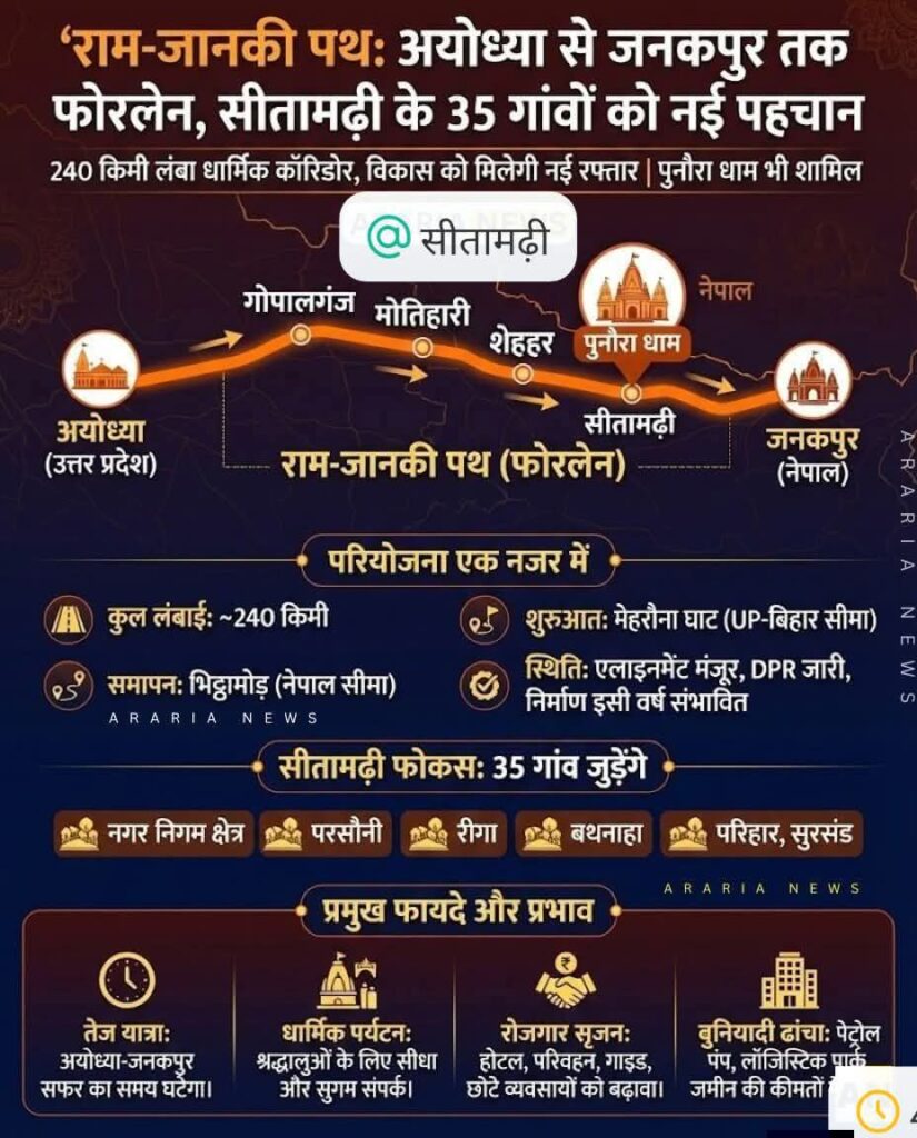 इस फोरलेन की सबसे बड़ी विशेषता यह है कि यह माता जानकी की प्रकाट्यस्थली पुनौरा धाम को सीधे हाईवे से जोड़ेगा, जहां भव्य मंदिर निर्माण कार्य प्रगति पर है। इसके पूरा होने के बाद अयोध्या–पुनौरा धाम–सीतामढ़ी–शिवहर–जनकपुर की यात्रा पहले से कहीं अधिक तेज़, आरामदायक और सुरक्षित होगी।