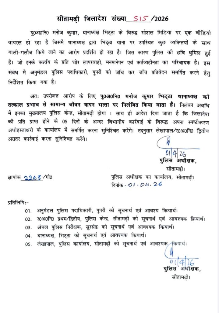 सीतामढ़ी: जिले में एक बड़ी प्रशासनिक कार्रवाई करते हुए भिट्ठा थाना के थानाध्यक्ष मनोज कुमार को तत्काल प्रभाव से निलंबित कर दिया गया है। यह कार्रवाई सोशल मीडिया पर वायरल हुए एक वीडियो के आधार पर की गई है।