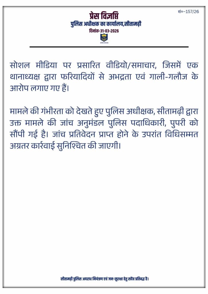 सीतामढ़ी भिट्ठा थाना वीडियो वायरल होने के बाद प्रशासन भी हरकत में आ गया है। मामले पर संज्ञान लेते हुए एसपी ने कहा कि वीडियो की जांच कराई जा रही है। उन्होंने साफ तौर पर कहा कि यदि आरोप सही पाए जाते हैं, तो संबंधित अधिकारी के खिलाफ कड़ी कार्रवाई की जाएगी और किसी को भी बख्शा नहीं जाएगा।