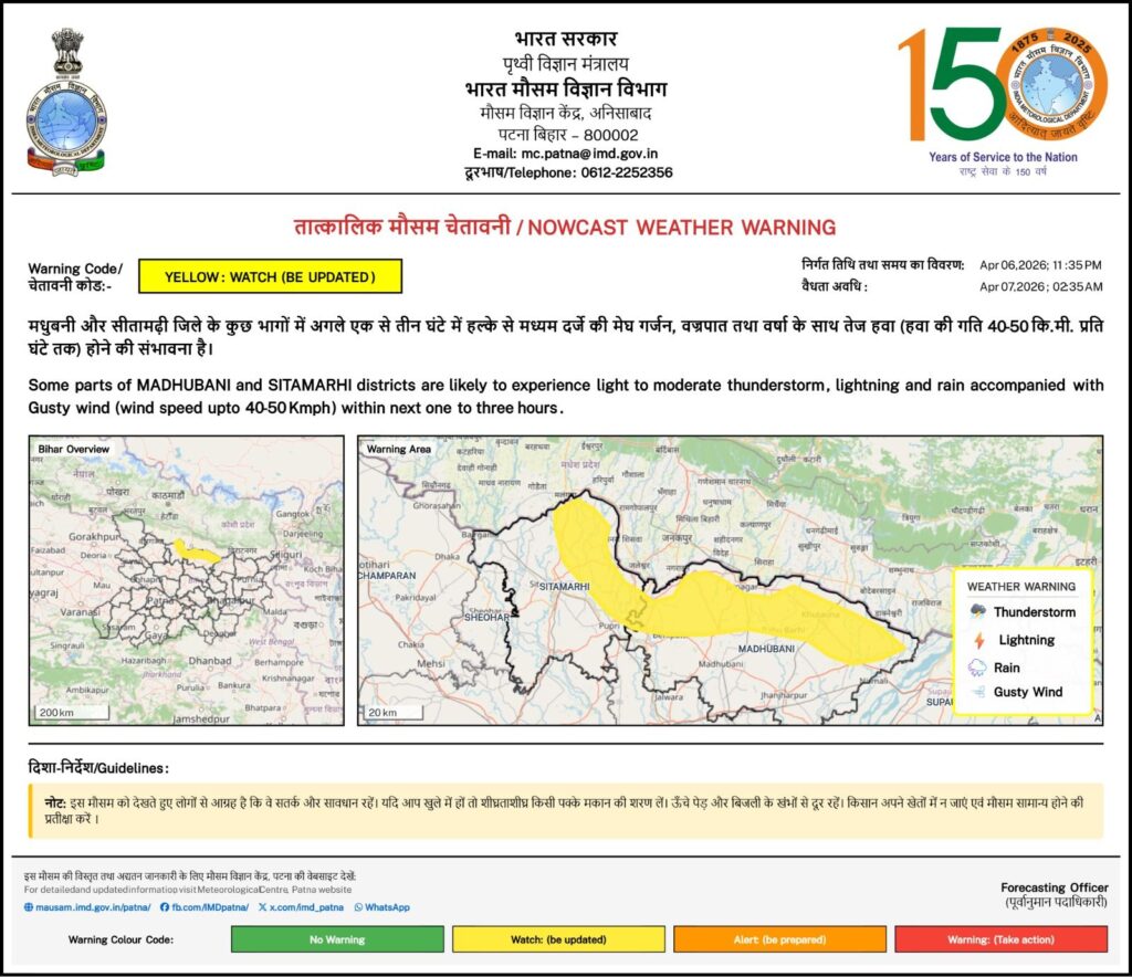 मौसम विभाग के अनुसार, सीतामढ़ी और मधुबनी में