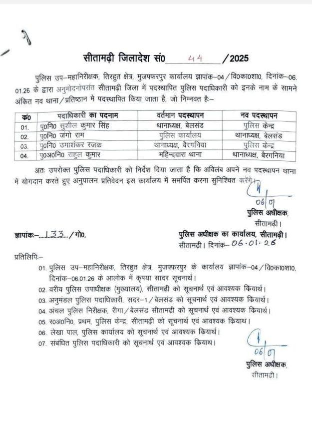 सीतामढ़ी जिले में पुलिस प्रशासन ने बड़ा प्रशासनिक कदम उठाते हुए दो थानाध्यक्षों का तबादला कर दिया है। यह कार्रवाई जिले के पुलिस अधीक्षक अमित रंजन के निर्देश पर की गई है, जिससे पुलिस महकमे में हलचल तेज हो गई है।