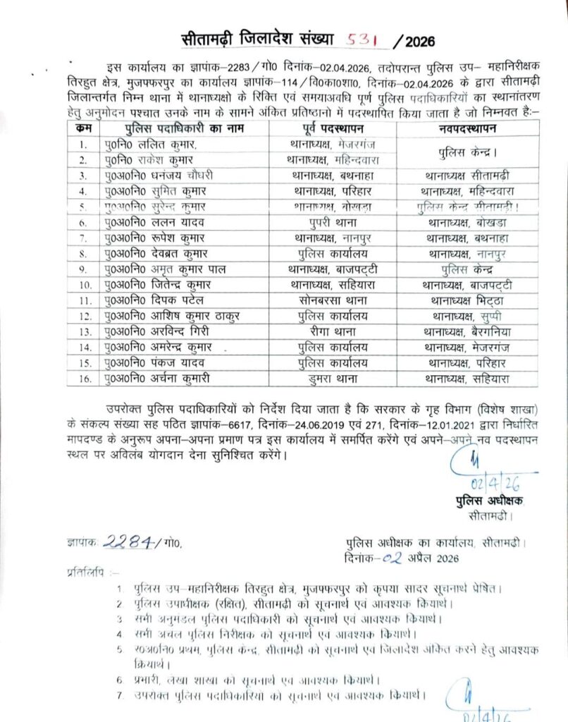 सीतामढ़ीबिहार के सीतामढ़ी जिले में कानून-व्यवस्था को मजबूत करने के उद्देश्य से पुलिस अधीक्षक अमित रंजन ने बड़ा प्रशासनिक कदम उठाया है। जिलादेश संख्या 531/2026 के तहत 16 पुलिस पदाधिकारियों का तबादला किया गया है, जिससे पुलिस महकमे में हलचल मच गई है।