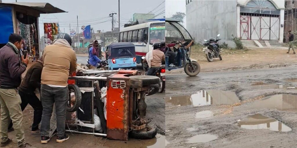 सीतामढ़ी में सड़क जर्जर, पुनौरा धाम मार्ग पर ई-रिक्शा पलटने से हड़कंप